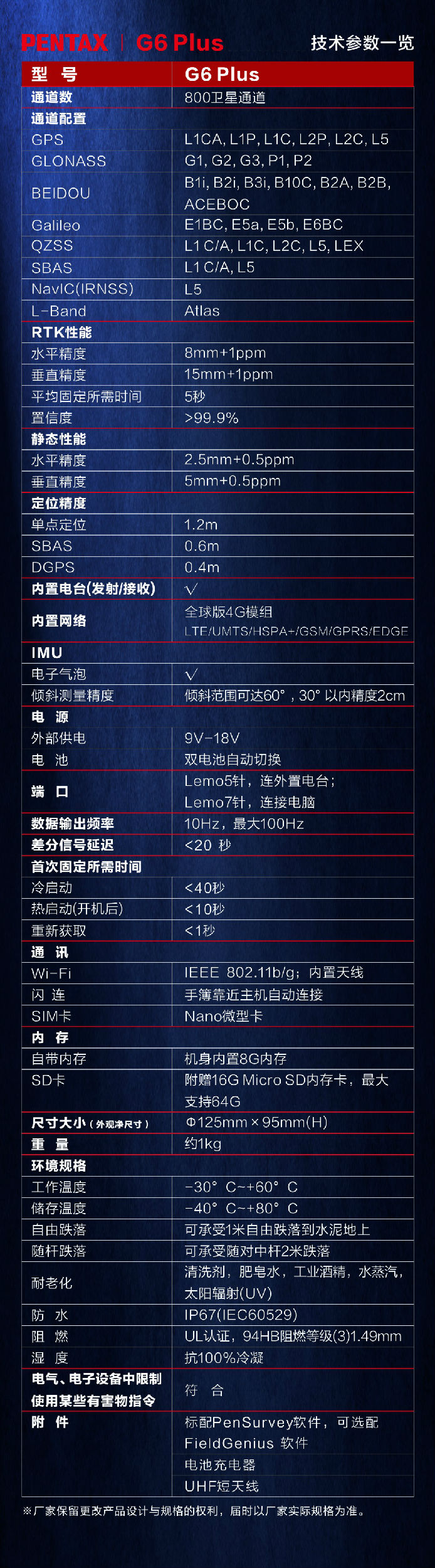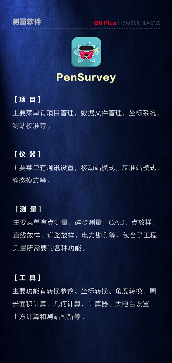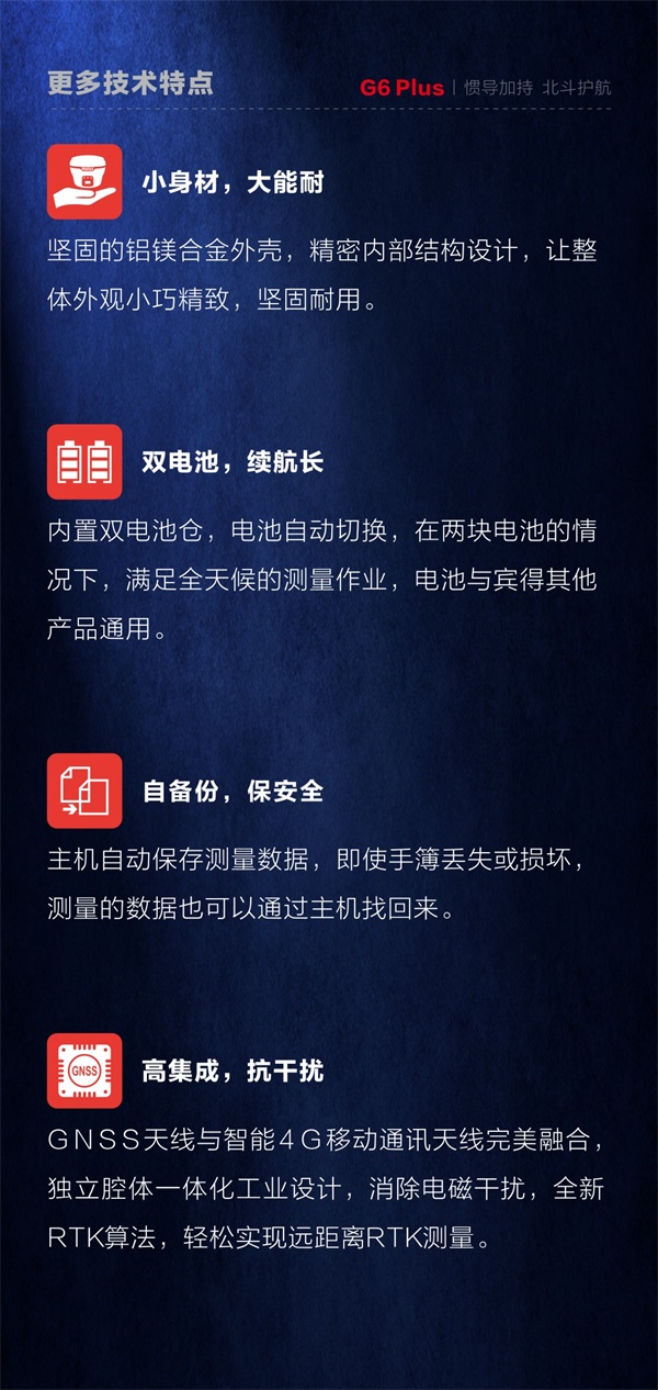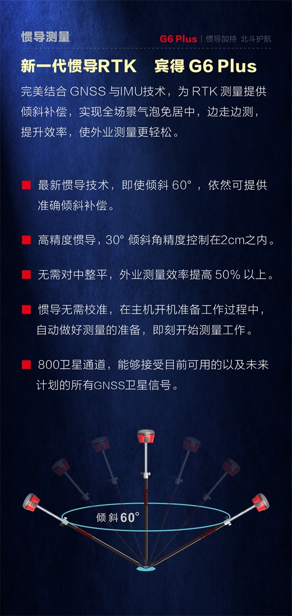 • 新一代惯导RTK 宾得 G6 Plus,完美结合 GNSS 与IMU技术,为 RTK 测量提供倾斜补偿,实现全场景气泡免居中,边走边测提升效率,使外业测量更轻松。...