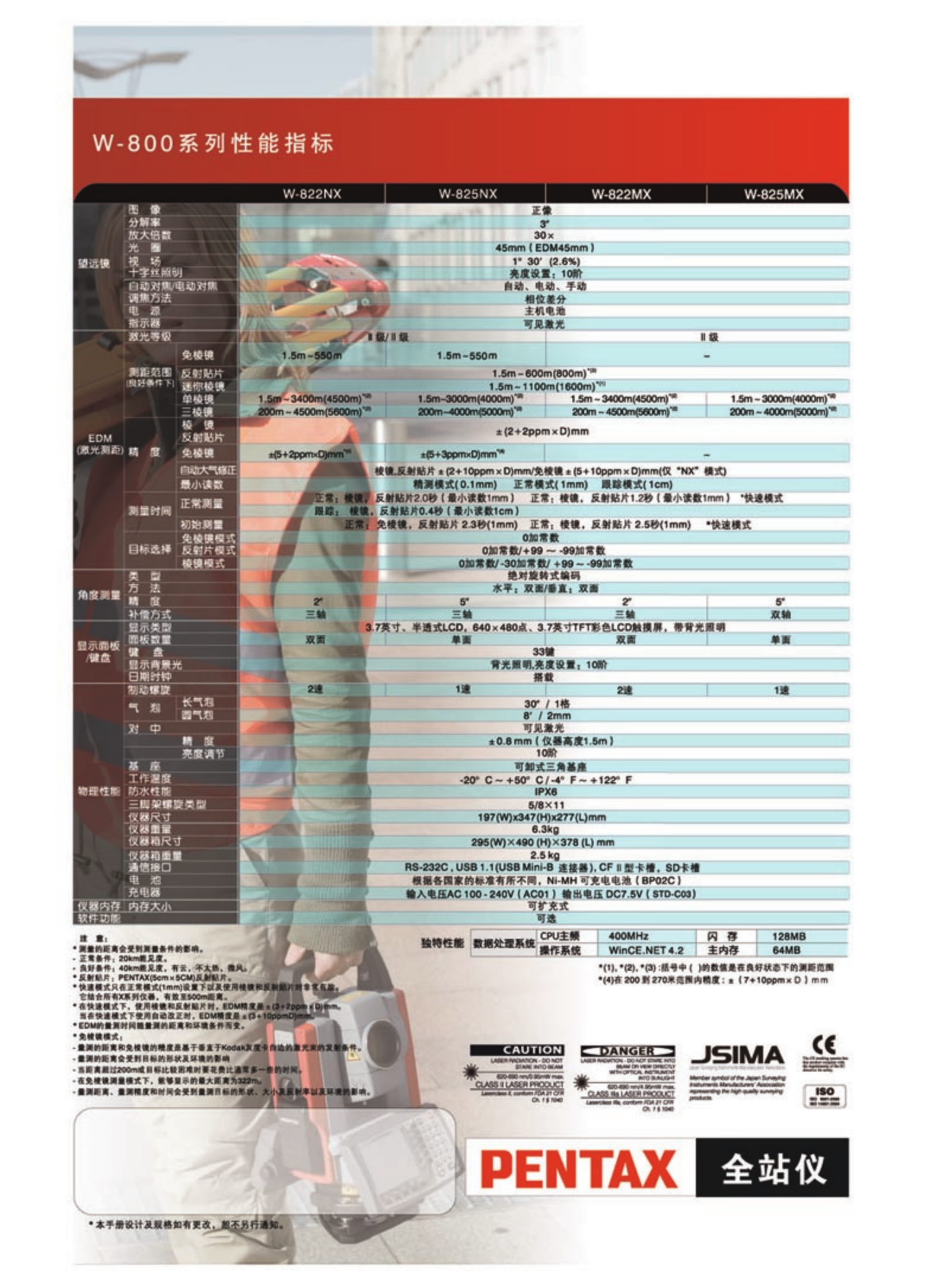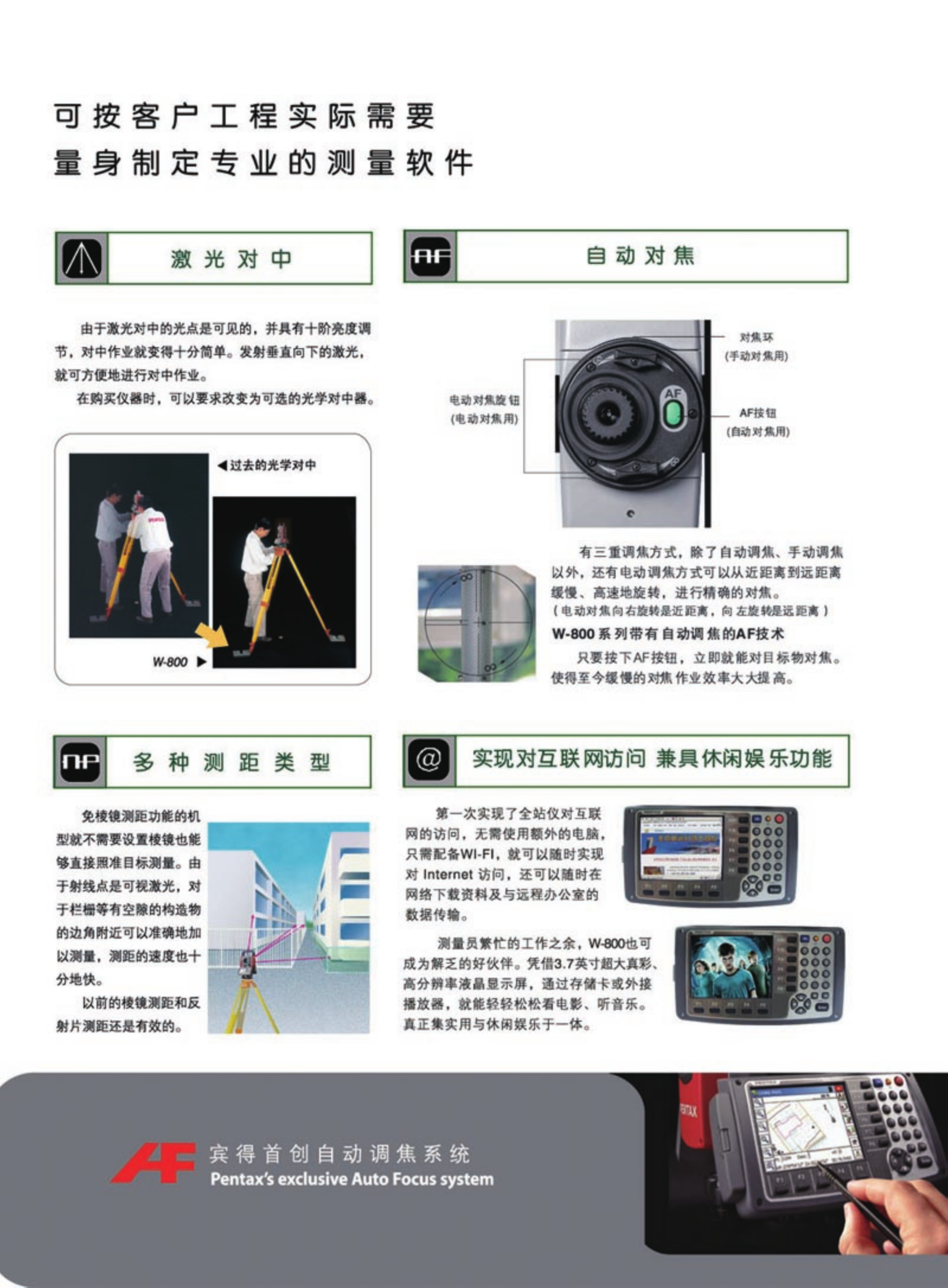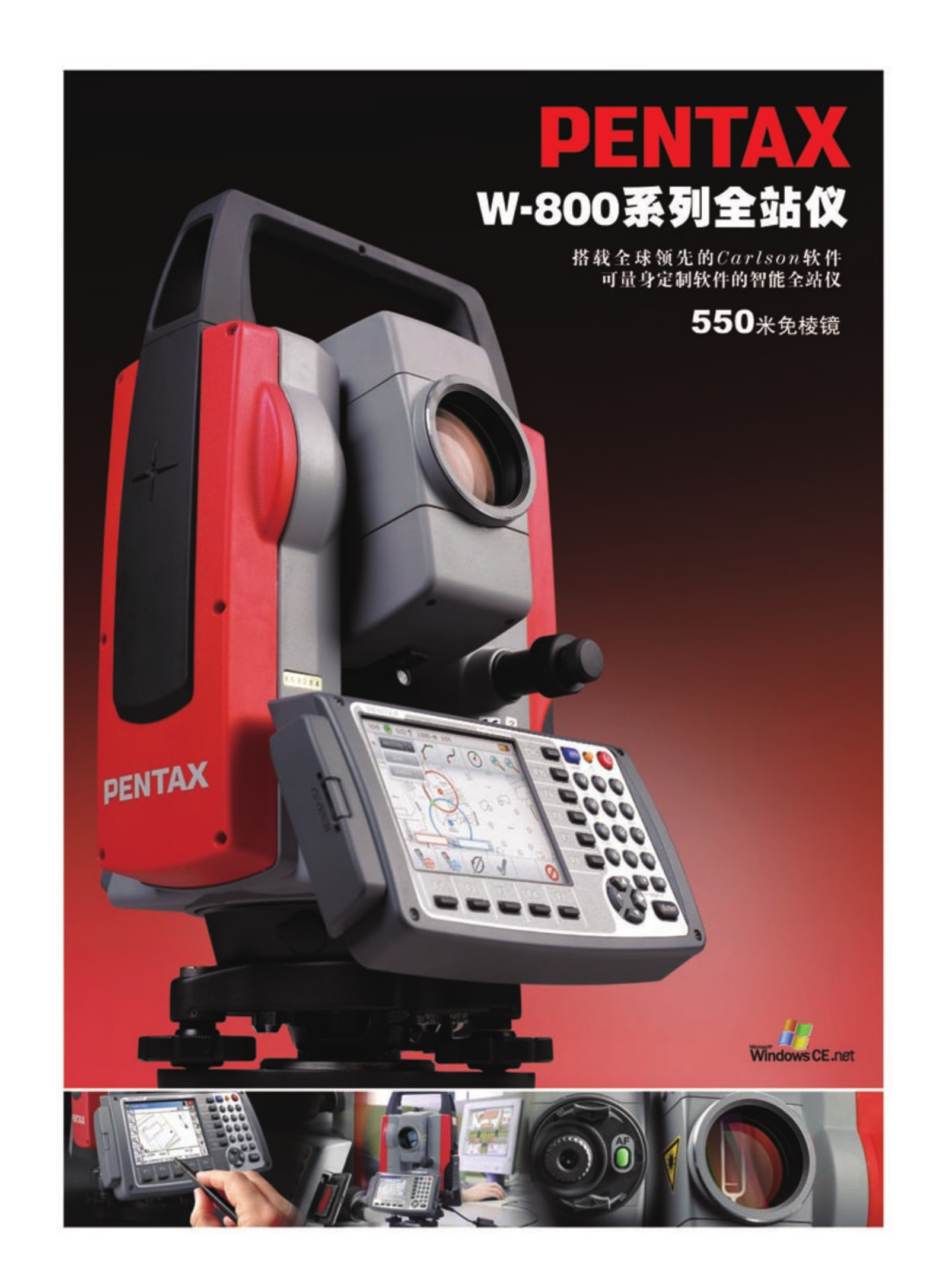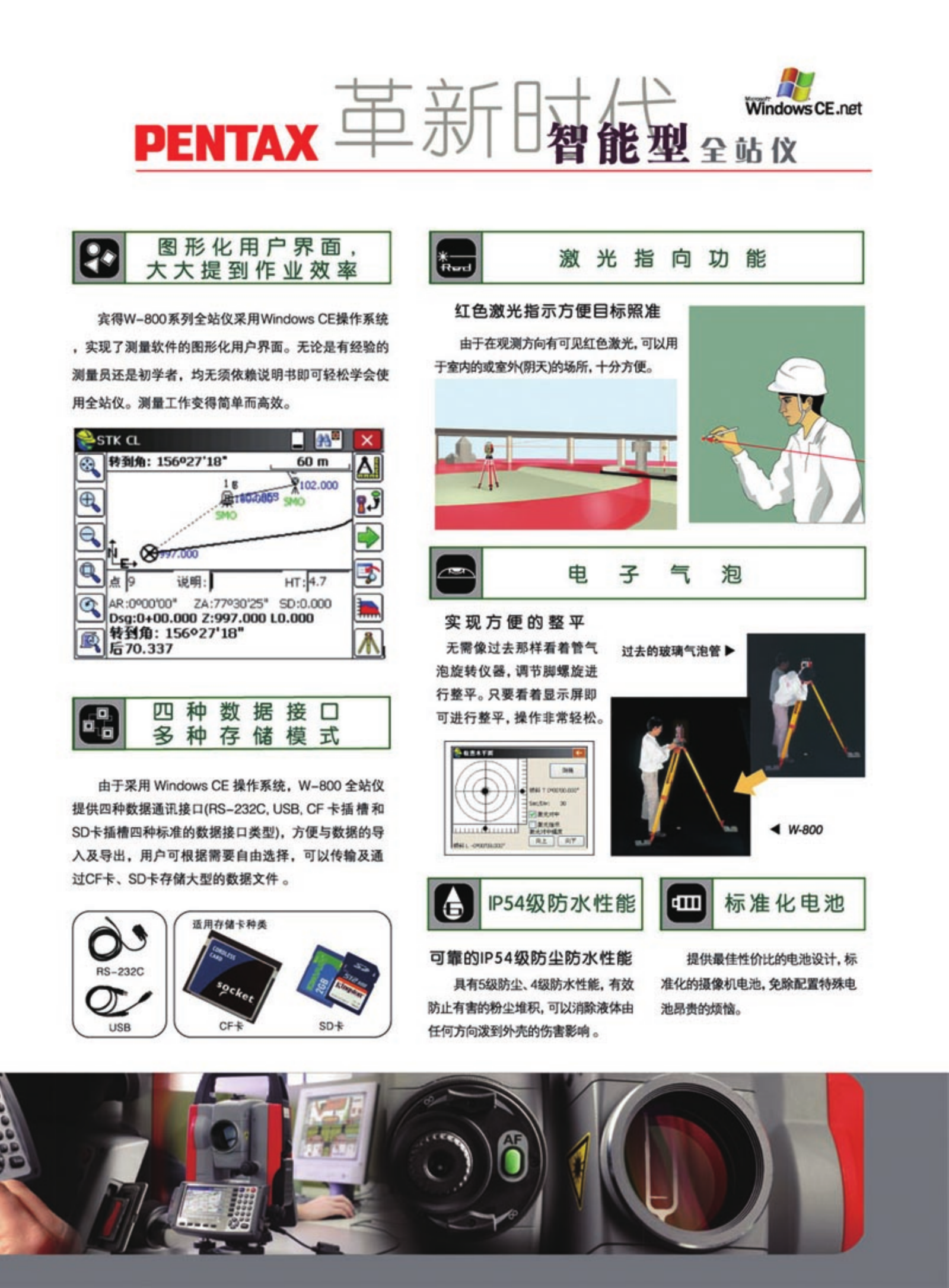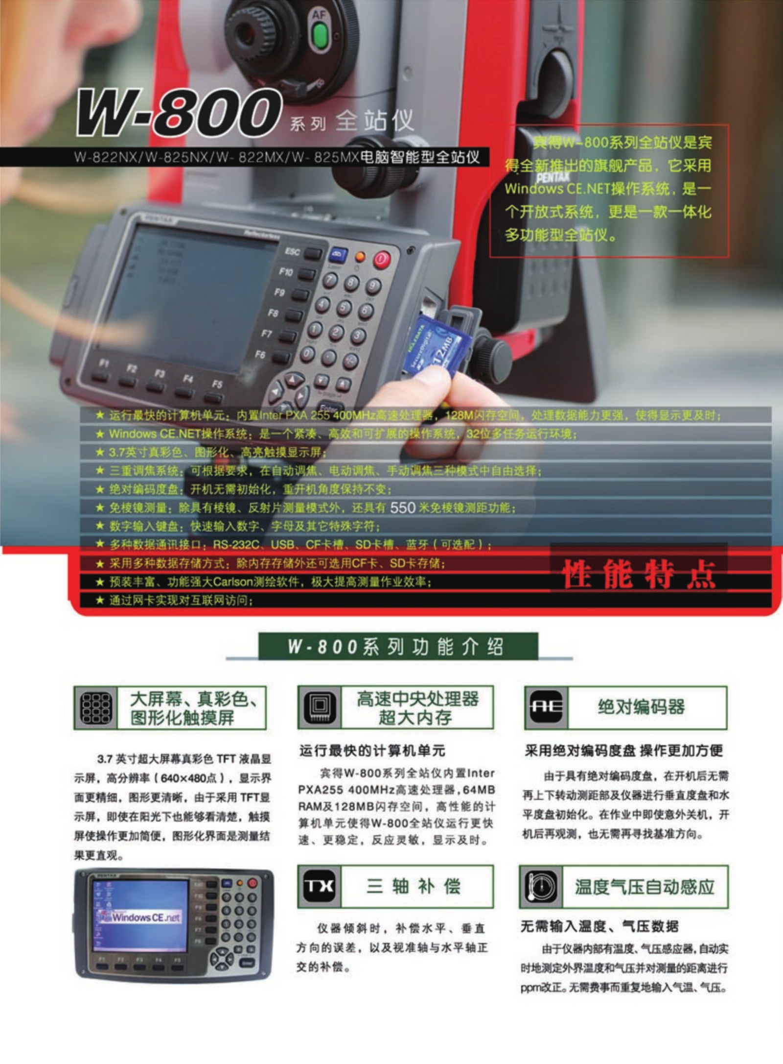 • 宾得W-800系列全站仪是宾得最新推出的旗舰产品,它采用Windows CE.NET操作系统,是一个开放式系统,更是一款一体化多功能型全站仪。内置Inter PXA 255 400Mhz高速处理器,128M闪存空间, 处理数据能力更强,使得显示更及时;3.7英寸真彩色、图形化、高亮触摸显示屏;具有世界独一无二的手动对焦,自动对焦,半自动对焦功能;开机无需初始化,重开机角度保持不变;具有550米免棱镜测距功能。...