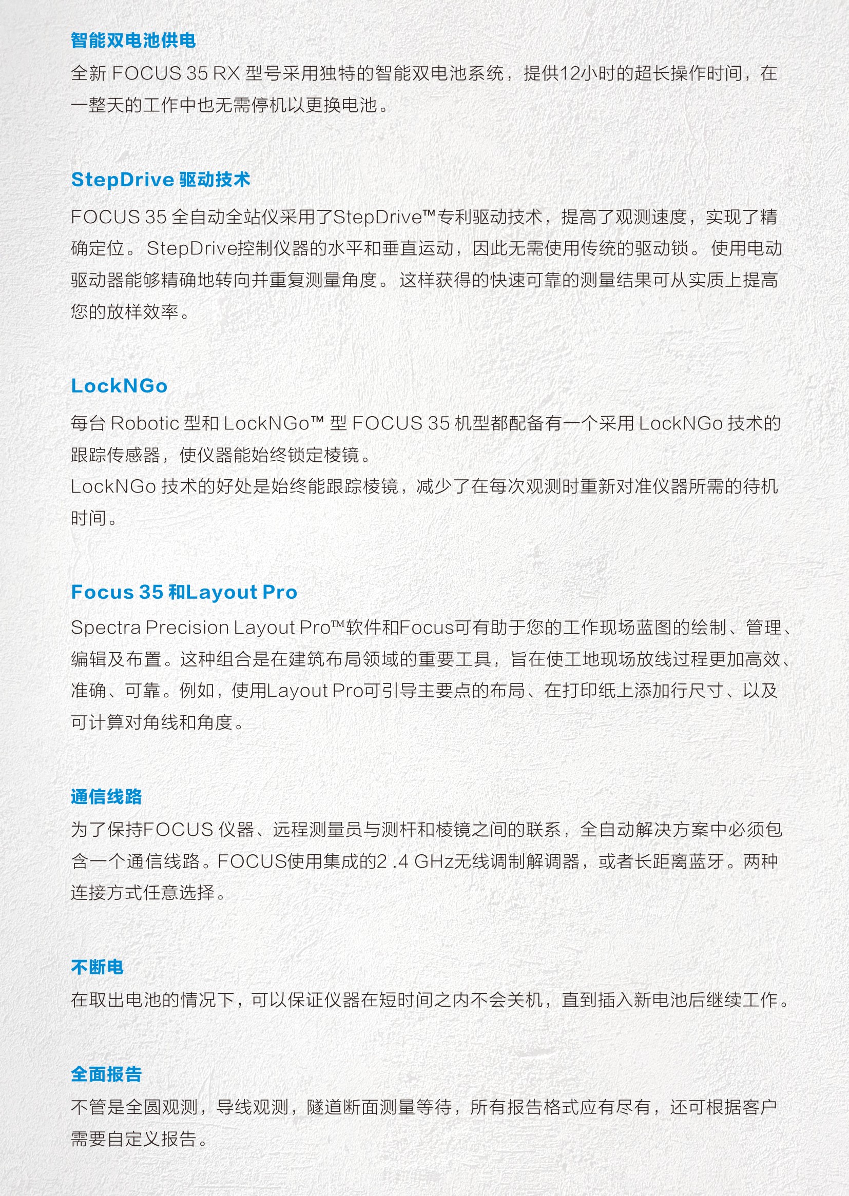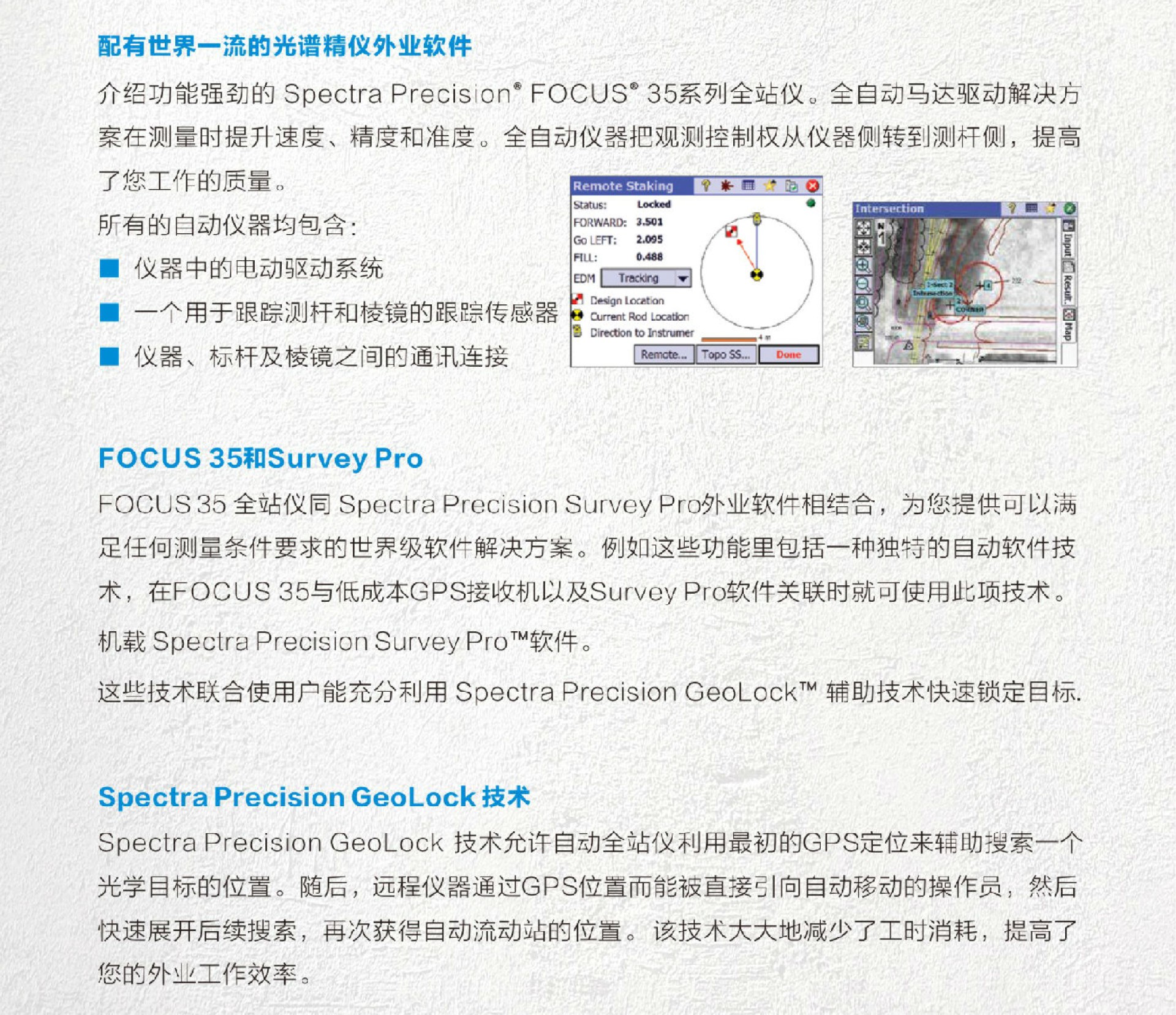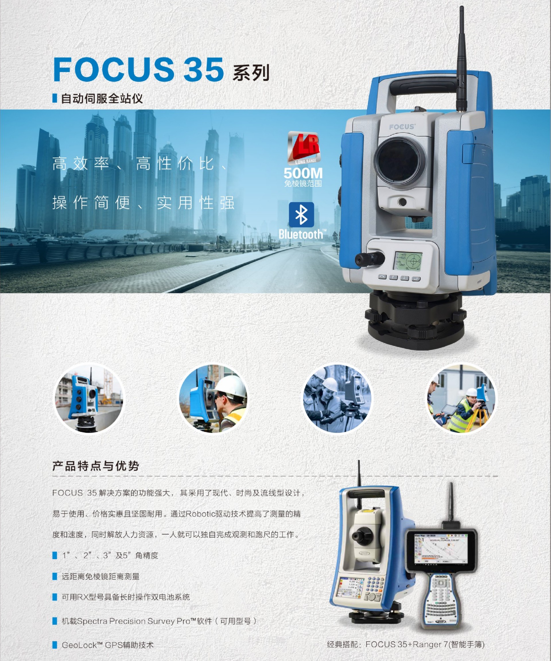 • FOCUS 35解决方案的功能强大,其采用了现代、时尚及流线型设计,易于使用、价格实惠而且坚固耐用。通过Robotic驱动技术提高了测量的精度和速度,同时解放人力资源,一人就可以独自完成观测和跑尺的工作。...